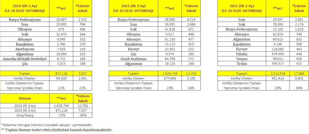 2024 yılı ilk 3 ay itibariyle, yabancıların Türkiye genelindeki toplam hisseye isabet eden yüzölçümü bazında tüm gayrimenkul yatırımları incelediğinde, yüzölçümü bazında ilk sırada Irak yer alıyor. Irak’ı Afganistan, İran, Rusya Federasyonu, Almanya, Azerbaycan, Amerika Birleşik Devletleri, Kazakistan, Çin ve Ukrayna takip ediyor.
