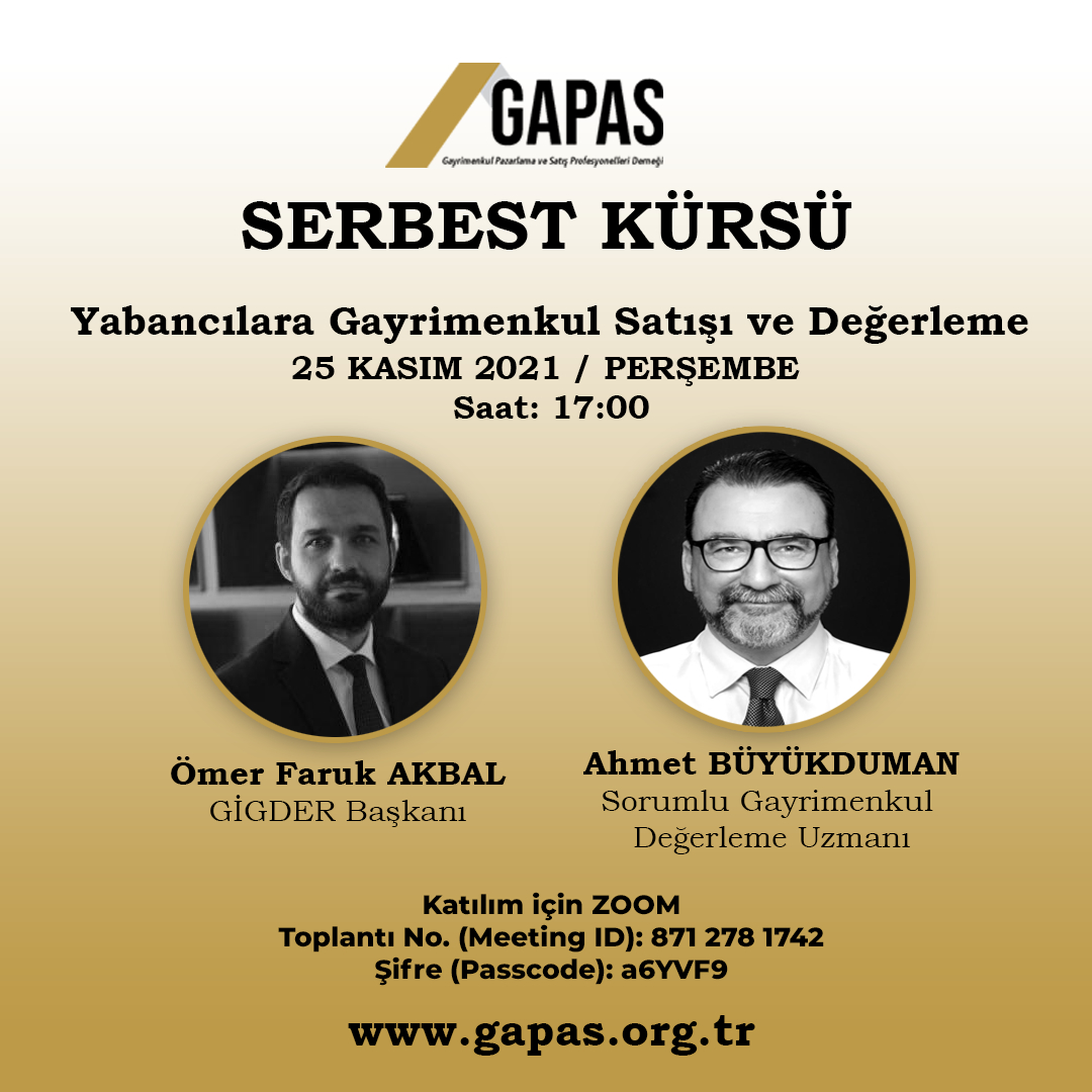 Gayrimenkul Pazarlama ve Satış Profesyonelleri Derneği (GAPAS) tarafından organize edilen “Serbest Kürsü” programlarının 25 kasım perşembe günü ZOOM üzerinden online olarak gerçekleştirilecek etkinliğinde Gayrimenkul Yurt Dışı Tanıtım Derneği (GİGDER) Başkanı Ömer Faruk Akbal ile Sorumlu Gayrimenkul Değerleme Uzmanı Ahmet Büyükduman, “Yabancılara Gayrimenkul Satışı ve Değerleme” konusunu değerlendirecekler.