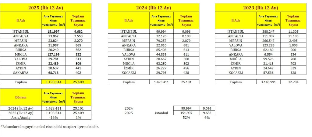 Tüm gayrimenkul cinsinden 2025 yılı itibariyle en çok tercih edilen illerde satış adeti bazında ise ilk sırayı İstanbul aldı. İstanbul ilini sırası ile Antalya, Mersin, Ankara, Bursa, Muğla, Yalova, İzmir, Aydın ve Sakarya izledi.