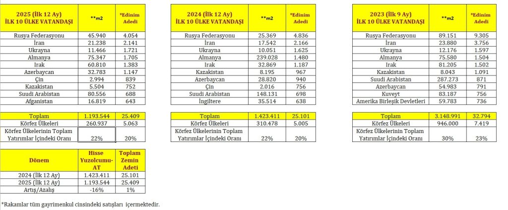Yabancı gayrimenkul yatırımlarında Körfez ülkelerinin payı geçen seneki gibi 2025’te de %22 olarak gerçekleşti