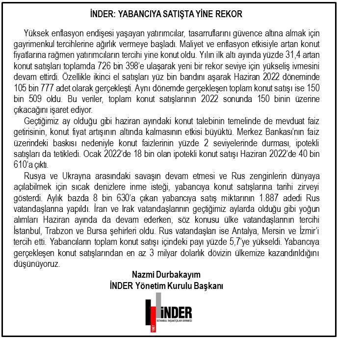 Konut satış istatistiklerini değerlendiren İstanbul İnşaatçılar Derneği (İNDER) Başkanı Nazmi Durbakayım, yüksek enflasyon endişesi yaşayan yatırımcıların tasarruflarını güvence altına almak için gayrimenkul tercihlerine ağırlık vermeye başladığını belirterek maliyet ve enflasyon etkisiyle artan konut fiyatlarına rağmen yatırımcıların tercihinin yine konut olduğunu söyledi.