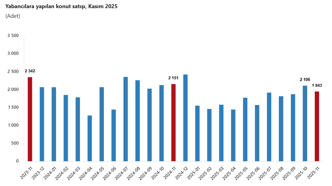 Yabancıya konut satışları ise kasım ayında yüzde 9.7 gerileyerek 1943 adet oldu. Yılın ilk 11 ayında yabancı yatırımcılara yapılan konut satış adetleri geçen yılın aynı dönemine göre yüzde 11.1 azalarak 18 bin 993 oldu.