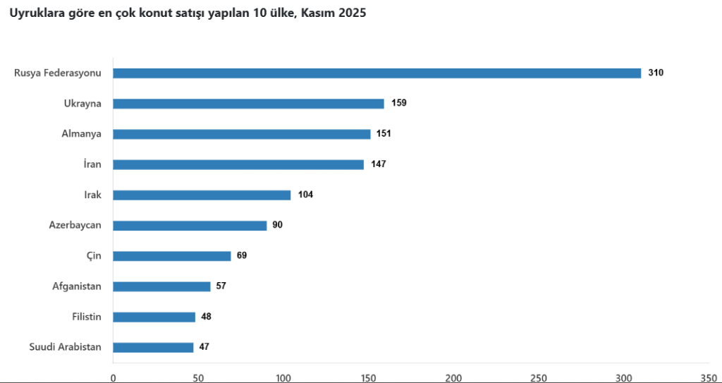 Kasım ayında ülke uyruklarına göre en fazla konut satışı sırasıyla 310 ile Rusya Federasyonu, 159 ile Ukrayna ve 151 ile Almanya vatandaşlarına yapıldı.
