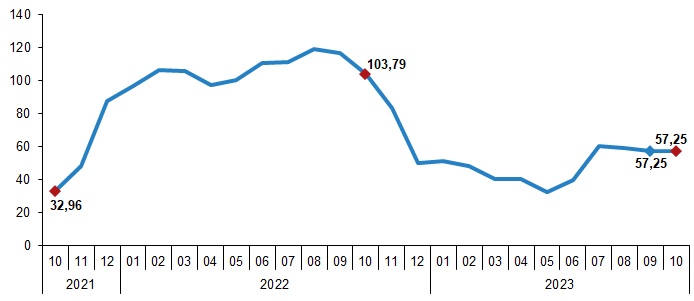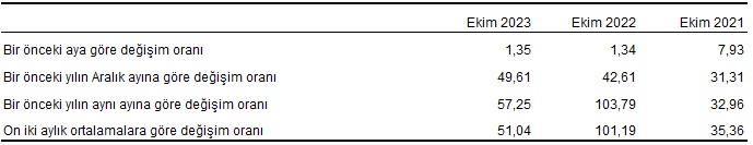 YD-ÜFE (2010=100) 2023 yılı Ekim ayında bir önceki aya göre %1,35, bir önceki yılın Aralık ayına göre %49,61, bir önceki yılın aynı ayına göre %57,25 ve on iki aylık ortalamalara göre %51,04 artış gerçekleşti.