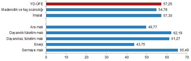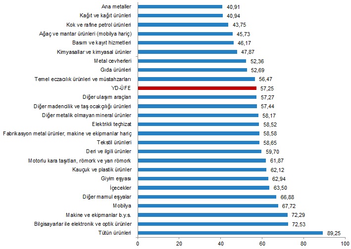 YD-ÜFE sektörlerinden ana metaller %40,91, kağıt ve kağıt ürünleri %40,94, kok ve rafine petrol ürünleri %43,75 ile endekslerin en az arttığı alt sektörler oldu. Buna karşılık tütün ürünleri %89,25, bilgisayarlar ile elektronik ve optik ürünler %72,53, b.y.s. makine ve ekipmanlar %72,29 ile endekslerin en fazla arttığı alt sektörler oldu.