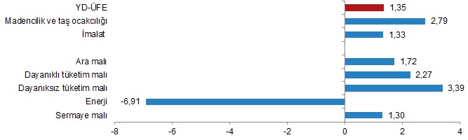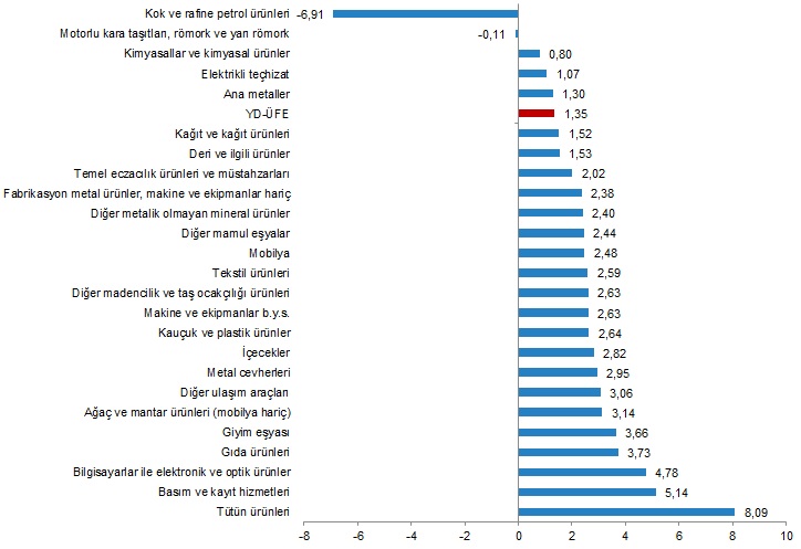 YD-ÜFE sektörlerinden kok ve rafine petrol ürünleri %6,91, motorlu kara taşıtları, römork ve yarı römork %0,11 ile endekslerin azalış gösterdiği alt sektörler oldu. Buna karşılık tütün ürünleri %8,09, basım ve kayıt hizmetleri %5,14, bilgisayarlar ile elektronik ve optik ürünler %4,78 ile endekslerin en fazla arttığı alt sektörler oldu.