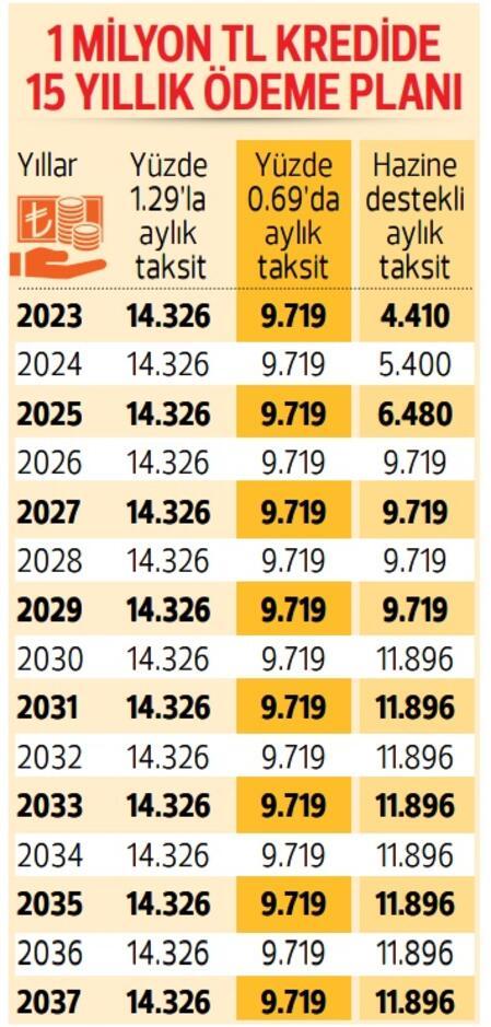“İlk 3 yılda aylık taksit ödemelerinin belirli bir kısmına, kredinin toplam vadesi bitmeden, son 8 yılda geri ödenmek şartıyla, Hazine ve Maliye Bakanlığı desteği verilecek. Bu destek her kesim için aynı olmayacak. Aile geliri 20 bin lira olan ile 40 bin lira olana farklı katkı yapılacak. Bu, aynı zamanda bir sosyal proje. Daha düşük hane geliri olana daha çok katkı verilir. Örneğin, 1 milyon liralık kredide kampanyasız taksit 14 bin 326 lirayken, kampanyadaki faiz oranı ile 9 bin 719 liraya düşecek. Buna devlet desteği verildiğinde ilk yıl ödeme 4 bin 410 lira olacak. Hem kira hem de kredi taksiti ödeyecek vatandaş bu yolla nefes alacak.