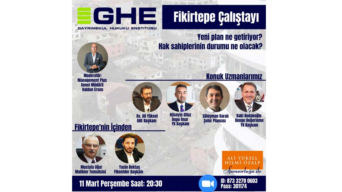 Gayrimenkul Hukuku Enstitüsü tarafından düzenlenen ve 11 Mart 2021 perşembe günü saat 20.30 ‘da başlayacak ve internet üzerinden canlı olarak yayınlanacak Fikirtepe Çalıştayı‘nda Fikirtepe’nin yeni imar planlarının neler getirdiği ve hak sahiplerinin durumunun ne olacağı sorularının cevapları konunun uzmanı isimler tarafından ele alınacak.
