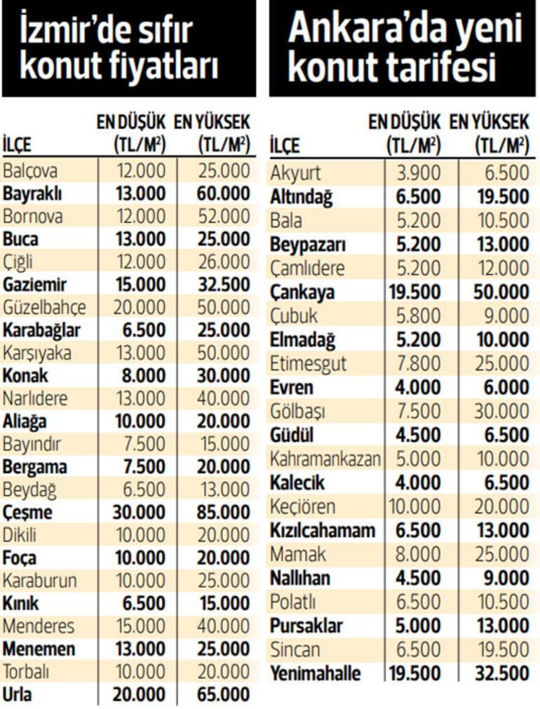 İzmir’de yeni bir binada en ucuz evin metrekare fiyatı 6 bin 500 lira olsa da birçok ilçede 10 bin lira bandının aşıldığı görülüyor. En yüksek metrekare fiyatına bakıldığında ise rakam 85 bin liraya kadar çıkıyor. 3 büyük ilde en uygun yeni konut seçenekleri ise Ankara’da. Çankaya, Keçiören ve Yenimahalle dışındaki ilçelerde metrekare fiyatı 10 bin liranın altında seçenek var. Hatta merkezi olmayan noktalarda fiyatlar 4-5 bin lira bandına düşüyor. Başkentte en yüksek fiyatlara bakıldığında ise metrekare satış fiyatı 50 bin lirayı buluyor.