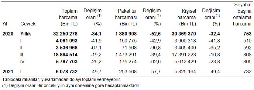 Yerli turistlerin, yurt içinde yaptıkları seyahat harcamaları 2021 yılının I. çeyreğinde bir önceki yılın aynı çeyreğine göre %49,7 artarak 6 milyar 78 milyon 732 bin TL olarak gerçekleşti. Bu harcamaların %95,8’ini 5 milyar 825 milyon 164 bin TL ile kişisel harcamalar, %4,2’sini ise 253 milyon 568 bin TL ile paket tur harcamaları oluşturdu. Seyahat başına yapılan ortalama harcama ise 732 TL oldu.