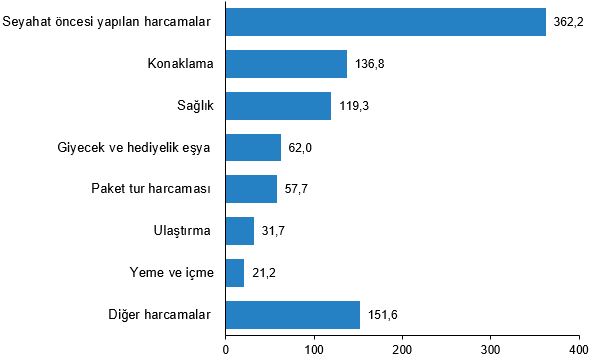 Bu çeyrekte yapılan seyahat harcamalarının geçen yılın aynı çeyreğine göre değişim oranları incelendiğinde en fazla artış %362,2 ile seyahat öncesi yapılan harcamalarda, %136,8 ile konaklama harcamalarında ve %119,3 ile sağlık harcamalarında oldu.