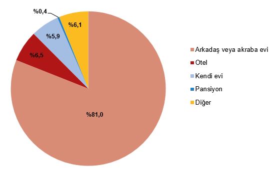 Bu çeyrekte seyahate çıkanlar 50 milyon 258 bin geceleme sayısı ile en çok “arkadaş veya akraba evinde” kaldı. Konaklama türlerine göre geceleme sayısında ikinci sırada 4 milyon 56 bin geceleme ile “otel” yer alırken, “kendi evi” 3 milyon 682 bin geceleme sayısı ile üçüncü sırada yer aldı.