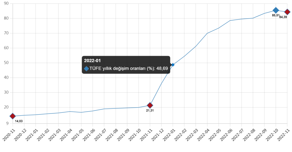 TÜFE’deki (2003=100) değişim 2022 yılı Kasım ayında bir önceki aya göre %2,88, bir önceki yılın Aralık ayına göre %62,35, bir önceki yılın aynı ayına göre %84,39 ve on iki aylık ortalamalara göre %70,36 olarak gerçekleşti.