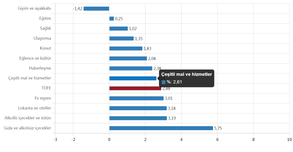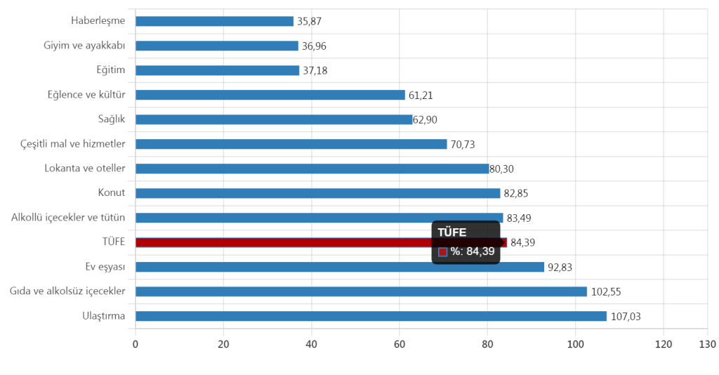 Bir önceki yılın aynı ayına göre en az artış gösteren ana grup %35,87 ile haberleşme oldu. Buna karşılık, bir önceki yılın aynı ayına göre artışın en yüksek olduğu ana grup ise %107,03 ile ulaştırma oldu.