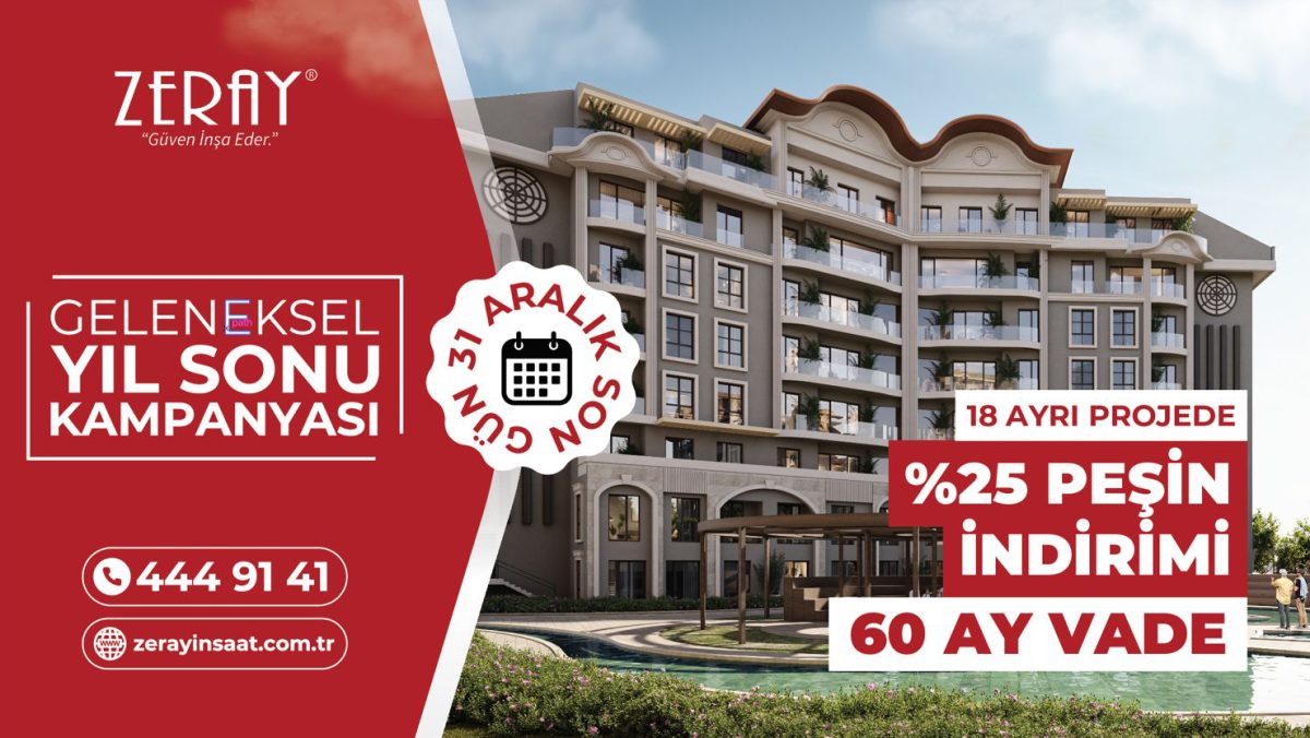 Peşin alımda %25 indirim ya da 60 ay vade imkanı sunan Zeray Geleneksel Yıl Sonu Kampanyası, bu dönemde nasıl ev sahibi olabiliriz diye düşünenler için büyük bir fırsat sunuyor. Kampanya 31 Aralık 2023 tarihi itibarıyla son bulacak.